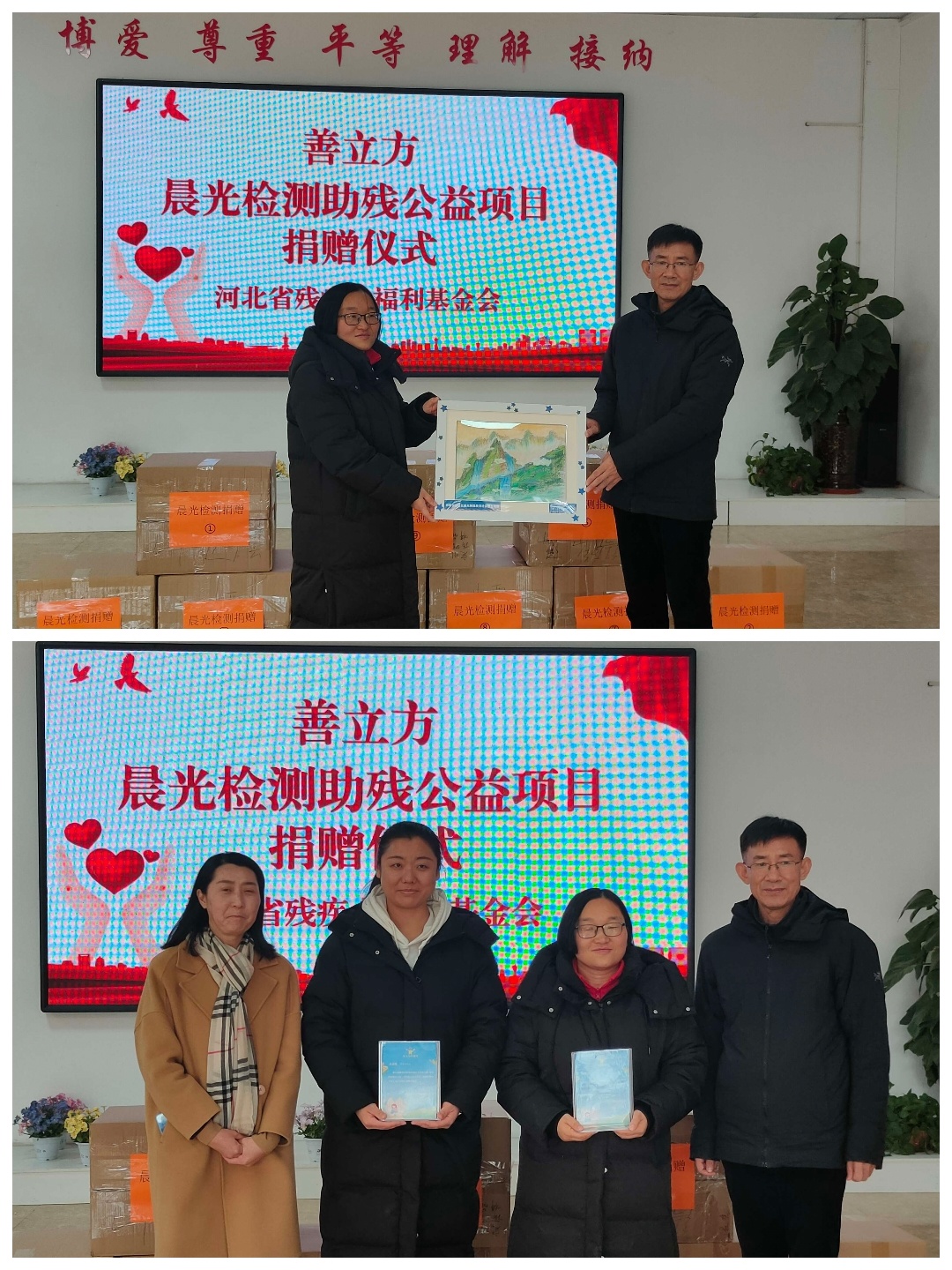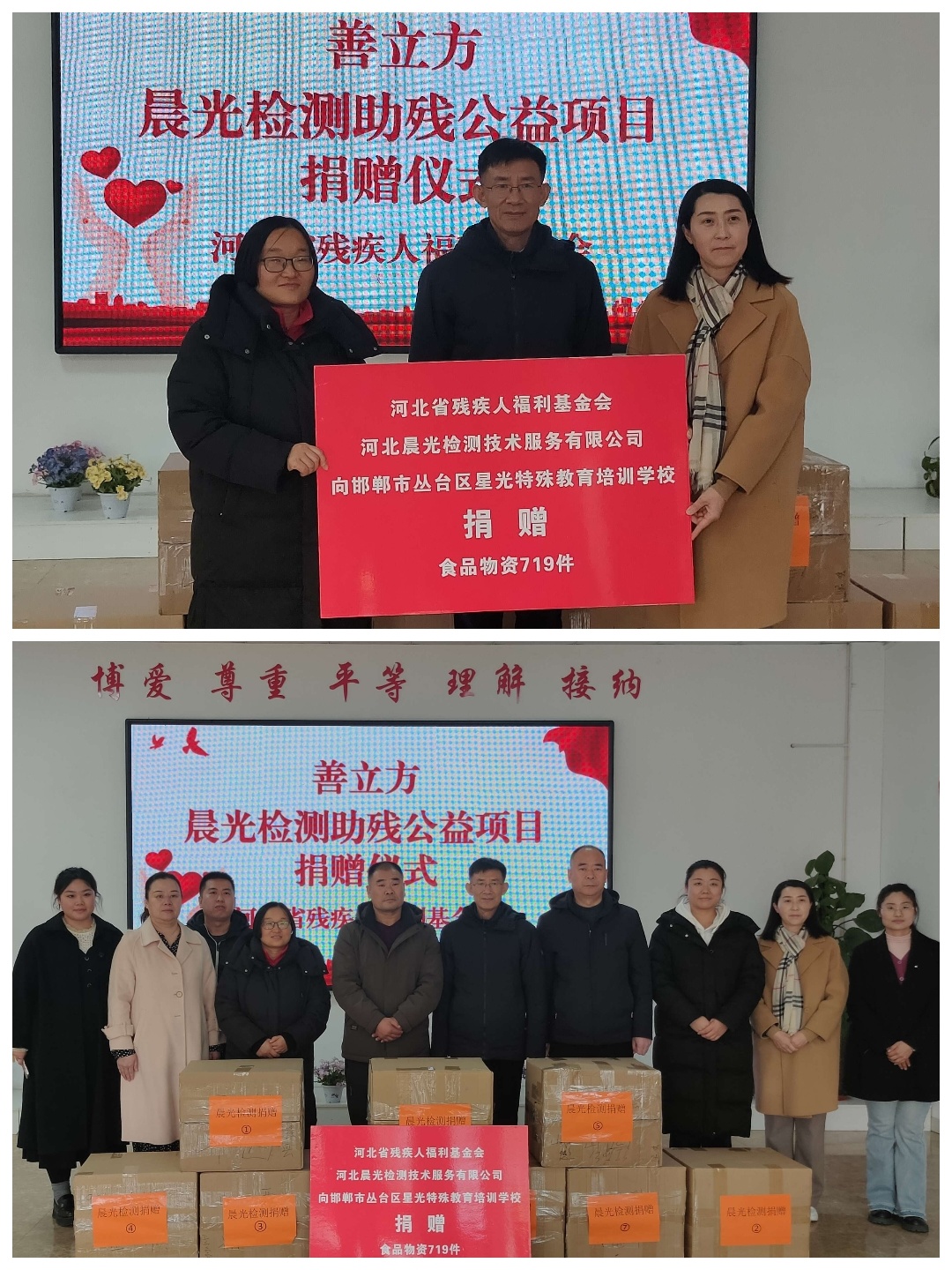 2024年1月10日上午善立方晨光檢測(cè)助殘公益項(xiàng)目,走進(jìn)星霖中心,為中心送來(lái)食品物資,出席本次活動(dòng)的有河北省殘疾人福利基金會(huì)副理事長(zhǎng)兼秘書(shū)長(zhǎng)邊路海,邯鄲市殘疾人聯(lián)合會(huì)副理事長(zhǎng)黃以林,邯鄲市叢臺(tái)區(qū)殘疾人聯(lián)合會(huì)理事長(zhǎng)劉樹(shù)聽(tīng),邯鄲市殘疾人聯(lián)合會(huì)輔具部主任郭小霞,河北晨光檢測(cè)技術(shù)服務(wù)有限公司經(jīng)理張曉芳,河北晨光檢測(cè)技術(shù)服務(wù)有限公司實(shí)驗(yàn)室主任高慧媛,邯鄲市從臺(tái)區(qū)星光特殊教育培訓(xùn)學(xué)校校長(zhǎng)張程靜。晨光檢測(cè)在發(fā)展業(yè)務(wù)的同時(shí),始終不忘回饋社會(huì)的初心,堅(jiān)持身體力行地投身公益事業(yè)。